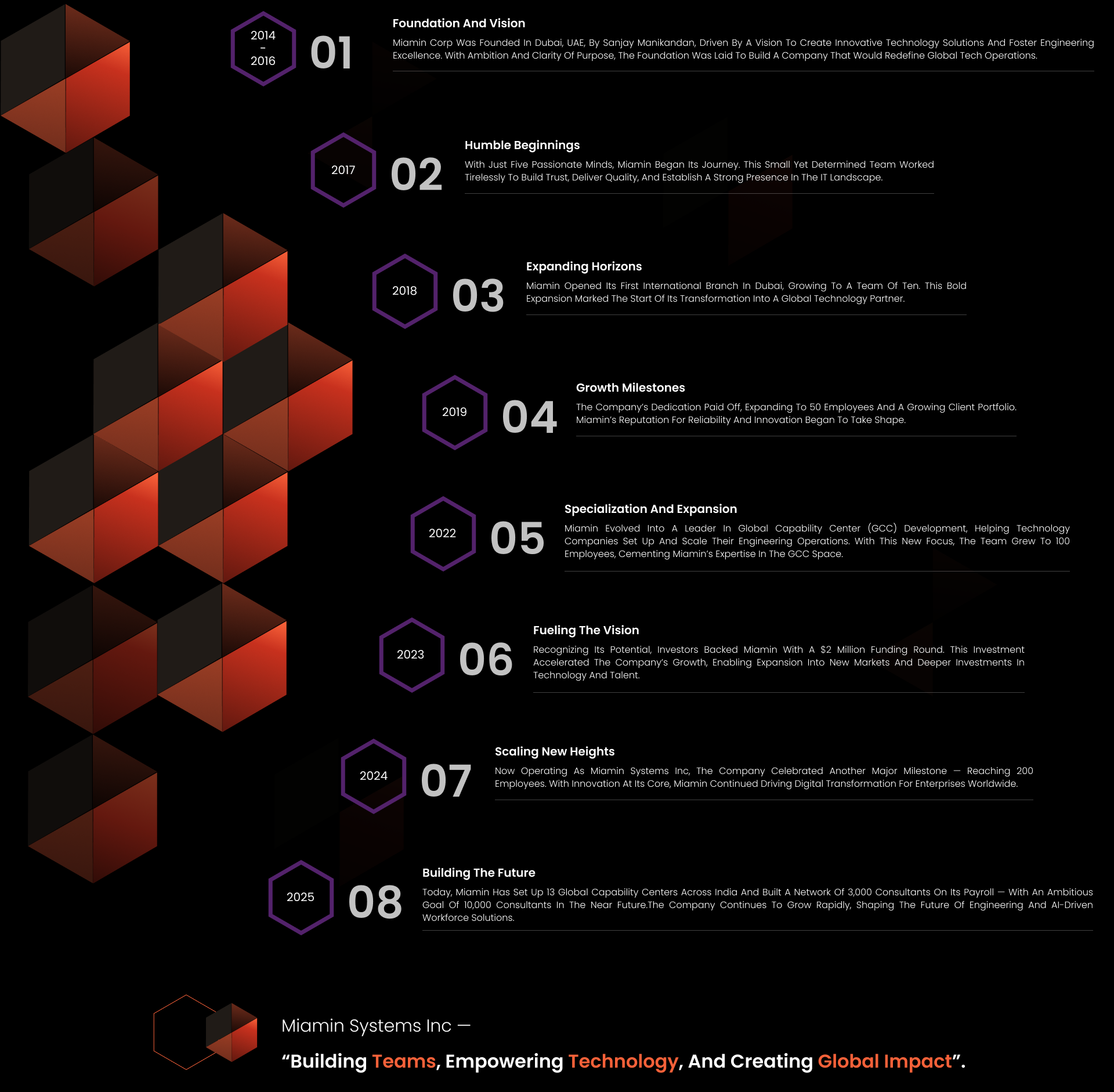 Founded in 2014 by Sanjay Manikandan, Miamin Systems, is a global leader in building and enabling Global Capability Centers (GCCs) with cutting-edge technology and smart automation. At the heart of our innovation is Miamin GCC OS, an AI-powered operating system designed to streamline every aspect of GCC operations—from talent acquisition, onboarding, and payroll to compliance, HR operations, and hiring manager dashboards.